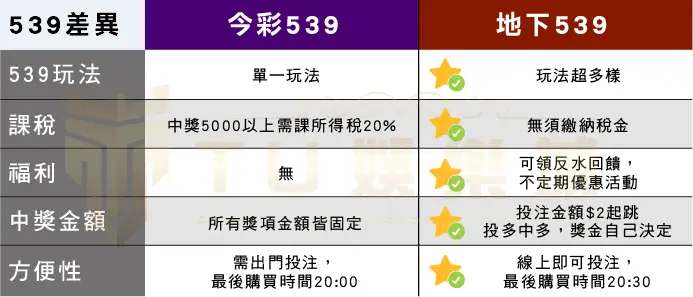 小編特地為大家整理出這個表格,這樣大家應該更瞭解其中差異性。會有這麼多人玩地下539的原因其實是獎金的差異以及中獎不用與其他人平分,這就差很多了呢。玩法也是一大原因,畢竟玩法多中獎機率也更高了。